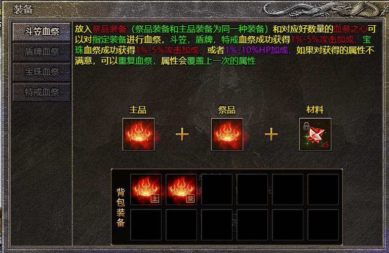 起源级别的斗笠、护盾、终极特戒和终极治疗宝珠可在血祭npc处进行装备血祭装备血祭需要准备2件同样的装备,其中1件作为主装备,1件作为祭品,以及一定数量的血祭之心