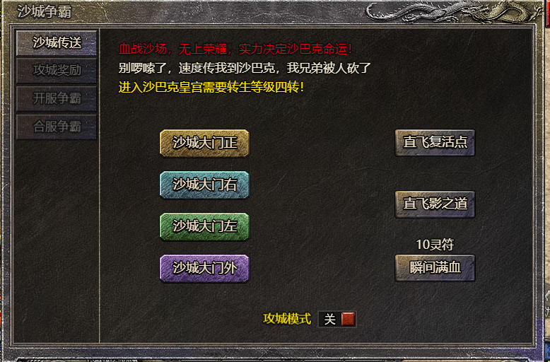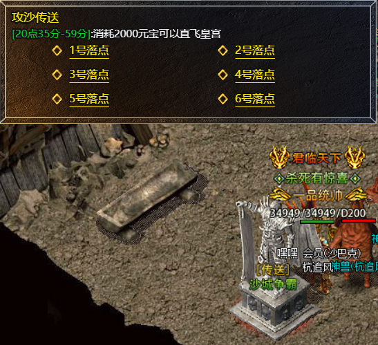 活动开时候可通过土城npc直接传送至沙城,复活点离皇宫最近