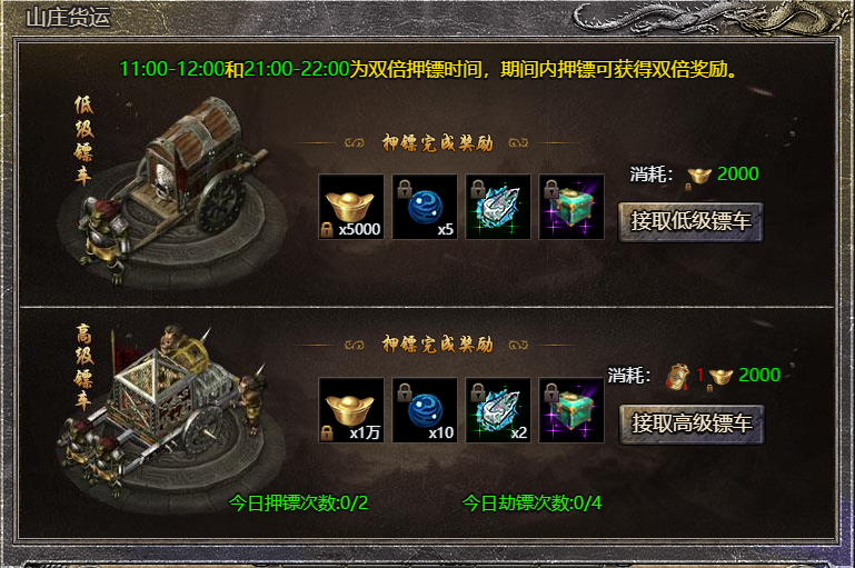 开放时间11:00-12:00和21:00-22:00,活动时间内押镖可获得双倍押镖奖励
