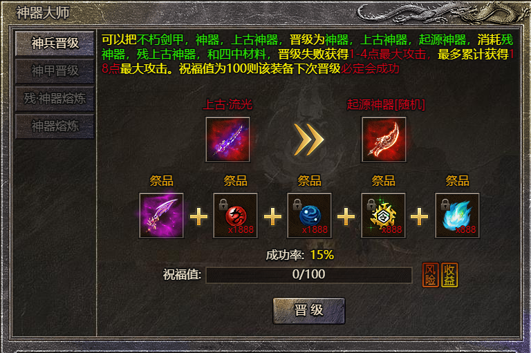 残神器可晋级为成品神器,需消耗1件残神器和对应数量的晋级材料,晋级失败会获得祝福值,祝福值满时下次晋级100%成功