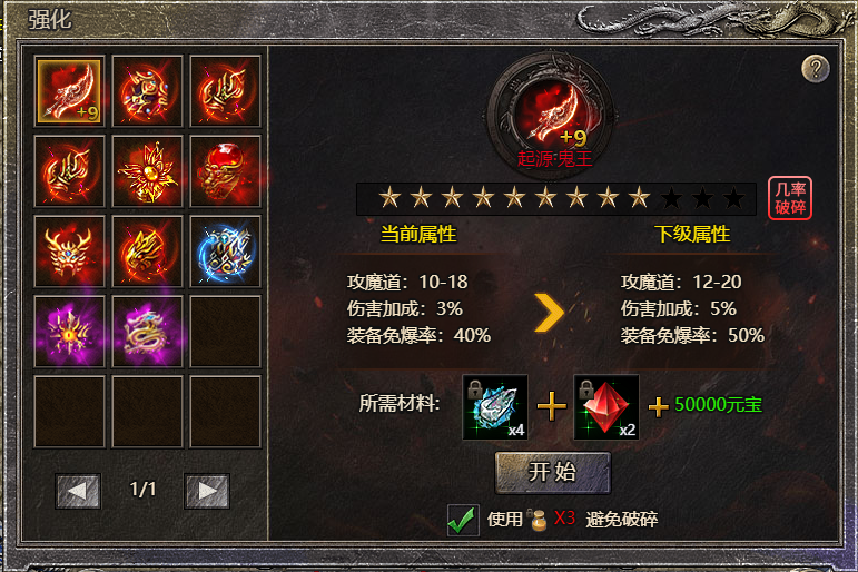装备强化满级12星,强化只强化装备,不能继承到其他同部位装备上。全身装备强化+7后会激活特殊角色特效,华丽无比所有部位强化12星后均可获得30点最大攻击属性。+7后对应的装备可额外获得特殊属性,+12后属性加成高达10%武器:伤害加成