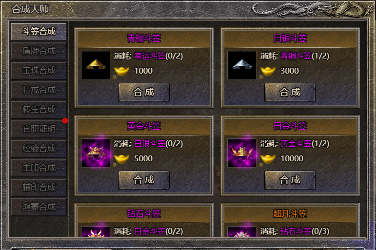 斗笠、护盾、治疗宝珠和特戒都可在合成大师处进行装备合成!低级的装备可以合成高一级的装备,属性和特殊属性都获得大幅度增加。