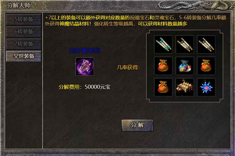 4转及以上装备可进行分解分解后有几率获得经验和稀有材料,稀有材料包括逆天改命的材料和锻造材料